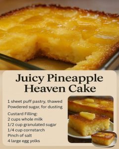 This pineapple cake recipe is a delightful combination of tropical sweetness and classic baking comfort. To prepare the cake, you’ll need all-purpose flour, sugar, baking soda, salt, butter, eggs, vanilla, crushed pineapple, and buttermilk. These simple ingredients come together to form a soft, moist cake with a light and refreshing flavor. The pineapple not only adds natural sweetness but also ensures the cake remains tender, making each bite a tropical treat perfect for any occasion.
